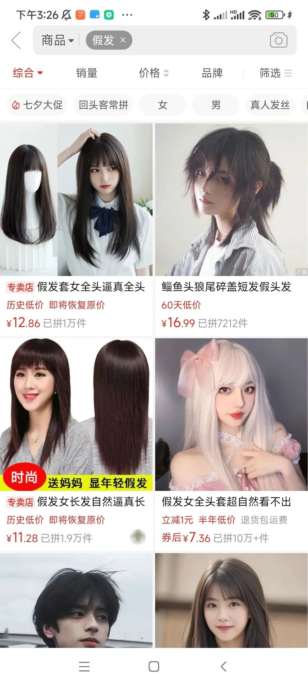 而我们在拼多多上假发,你会发现拼多多推荐的价格在十几块钱左右。