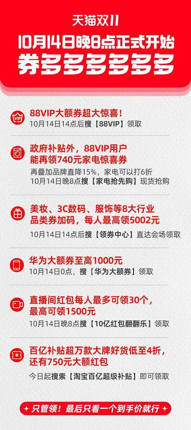 今年,天猫双十一的投入堪称近年来之最。除了常规的官方85折优惠和跨店满减(每满300元减50元)活动,平台还额外准备了高达300亿的消费券和红包,真可谓是“券海滔滔”。这些优惠券和红包将从今天下午14点起开始领取。那么,具体有哪些券,怎么领呢?请务必记住以下时间点: